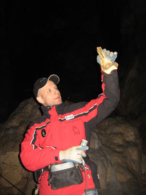 Our guide Fritz Geissler holds up a bone of a cave bear