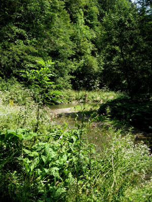 side of the river, next to the limestone cliffs of the Gösser