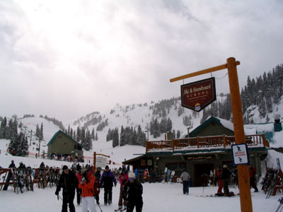 Gondola Base. We skied down a picturesque green run called Banff