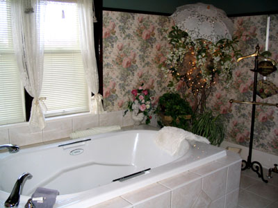 bathroom, an in-suite jacuzzi, a fireplace and a laptop computer