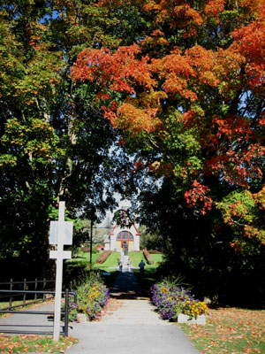 Church, built in 1922. In front of the church is a statue of Evangeline,