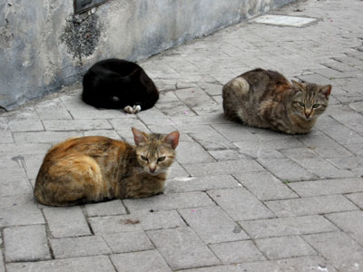 were getting ready for their first fares, while the pedestrian street