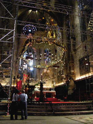 View towards the altar of La Seu, with Gaudi's chandelier