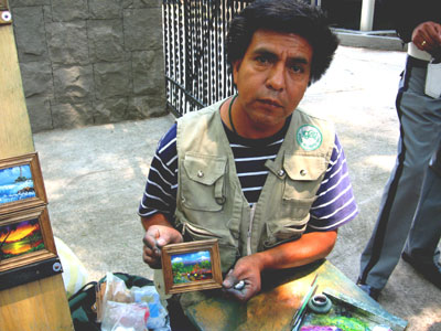 3 very colourful miniature paintings depicting typical Mexican scenes.