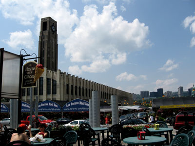 the hustle and bustle at the Atwater Market from the outdoor patio