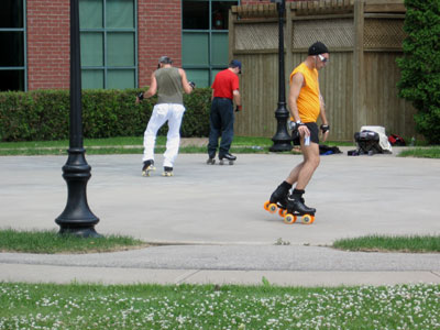 near some renovated condos I saw a group of three rollerskaters