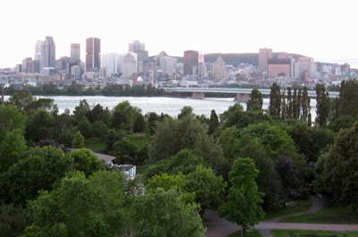 the St. Lawrence River and the downtown Montreal skyline. The sun
