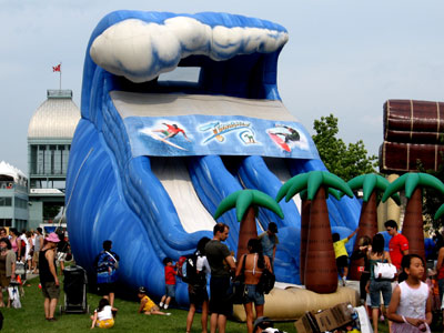 of huge inflatable slides. Freestyle skiers were jumping off a large