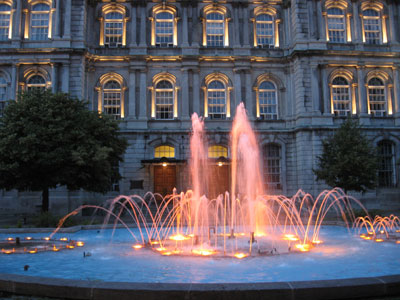 Illuminated fountain with the Montreal City Hall in the background