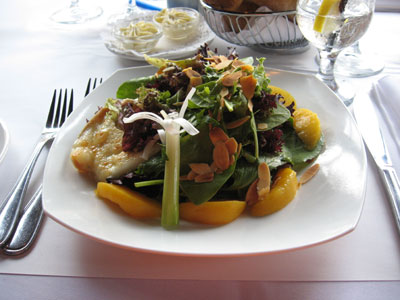 with almonds and a peach and mango vinaigrette. A delicious course