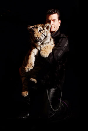 his animals home and feeds them. One of his Siberian tigers, Boomer,