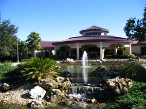 Driving up to the clubhouse on the brick drive, fountains and gardens