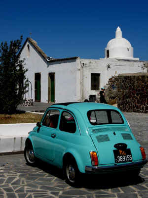 A Fiat Cinque Cento, in front of the Chiesa Vecchia di Quattropani