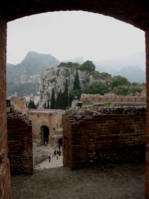 The Greek Theatre in Taormina, Mount Etna is hiding