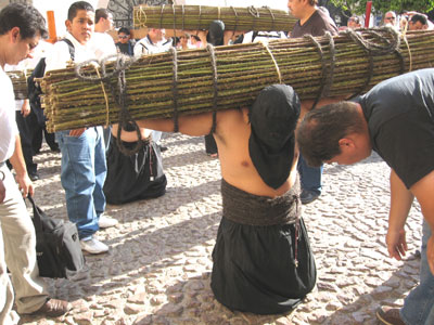 hoods, shackled, carrying heavy thorn bundles or flagellating themselves